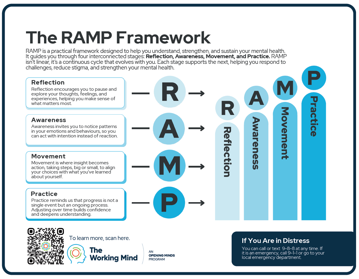 RAMP is a practical framework designed to help you understand, strengthen, and sustain your mental health. It guides you through four interconnected stages: Reflection, Awareness, Movement, and Practice. RAMP isn’t linear; it’s a continuous cycle that evolves with you. Each stage supports the next, helping you respond to challenges, reduce stigma, and strengthen your mental health.